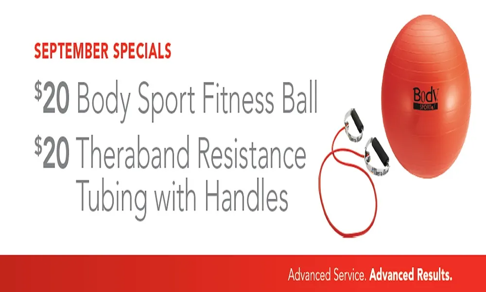 Throughout the month of September, Body Sport Fitness Balls are on special for $20 & Theraband Resistance Tubing with Handles are on special for $20. Body Sport Fitness Ball helps to focus on core strengthening & stability, promoting better posture while working at home or in the office. Theraband Resistance Tubing with Handles is a great tool to utilize in order to practice your exercises at home just as you do in therapy.
